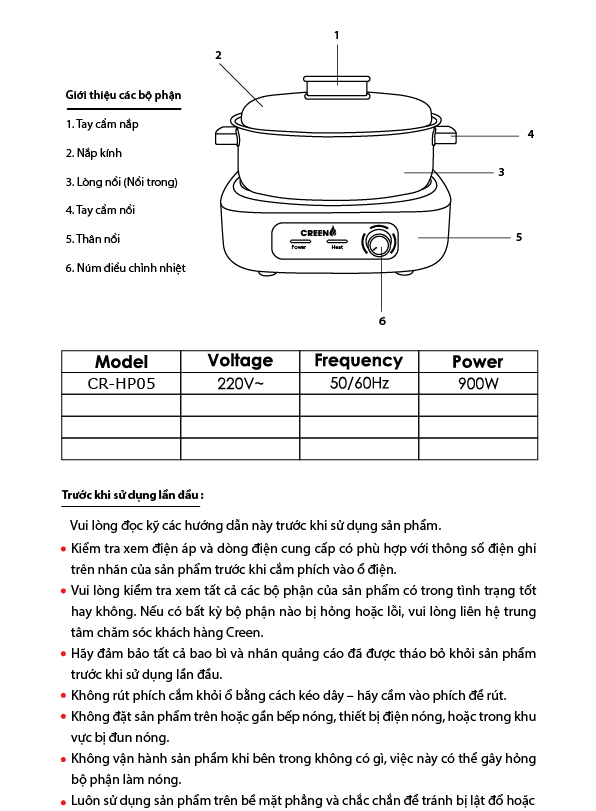Hướng dẫn sử dụng Nồi lẩu đa năng CREEN CR-HP05